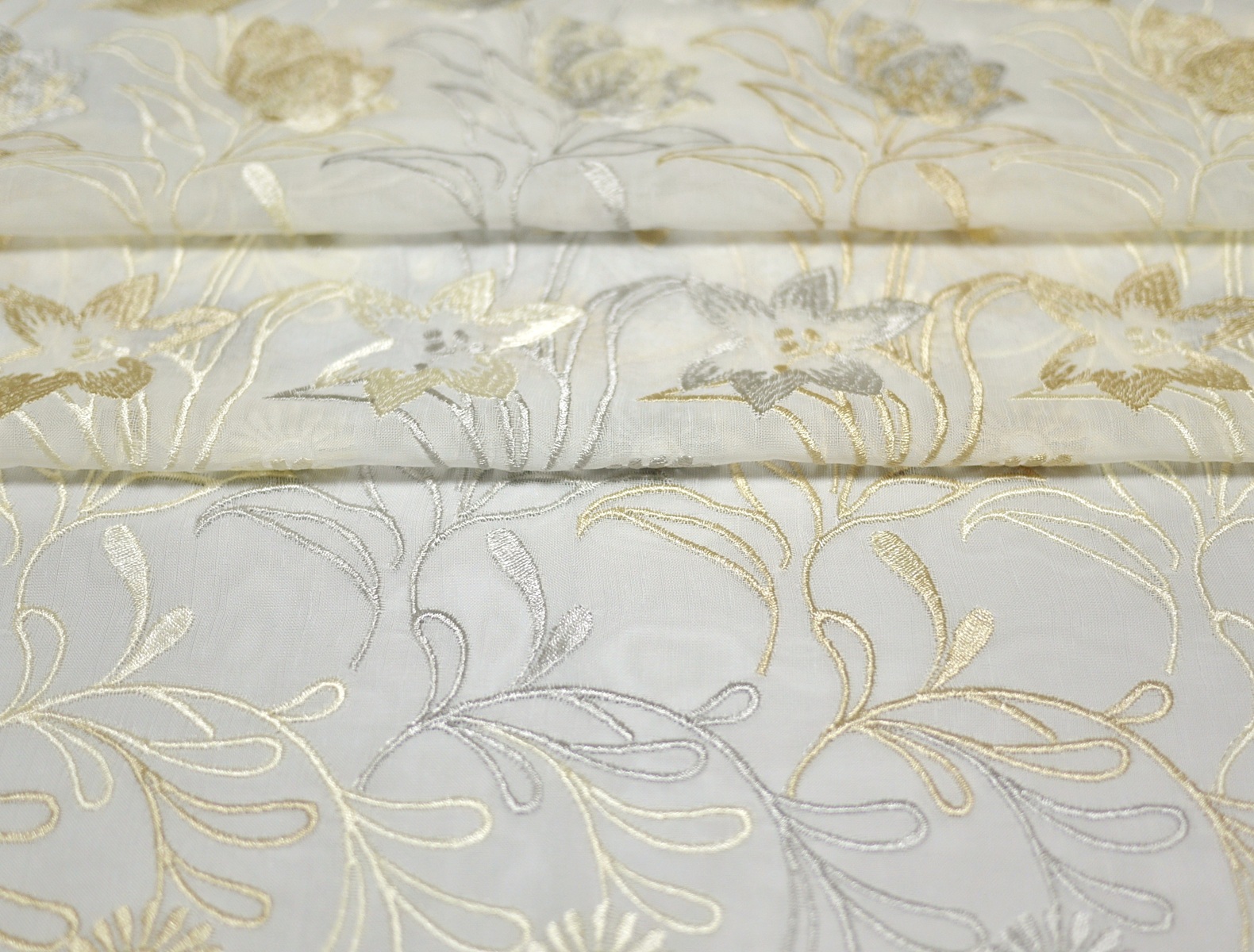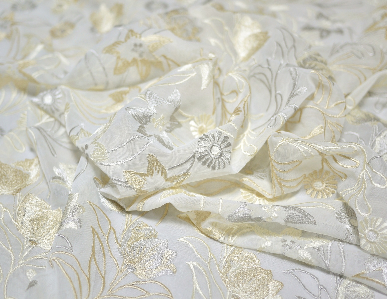 1877年にウィリアムモリスのデザインとして登録され、生命力あふれる葉や花が咲き乱れる楽園を描いた柄です。この柄を基に、新たにレースの刺繍柄としてデザイン・製作されました。光沢のある三色の刺繍糸が繊細に重なり合い、華やかで緻密な絵羽柄として仕上げられています。