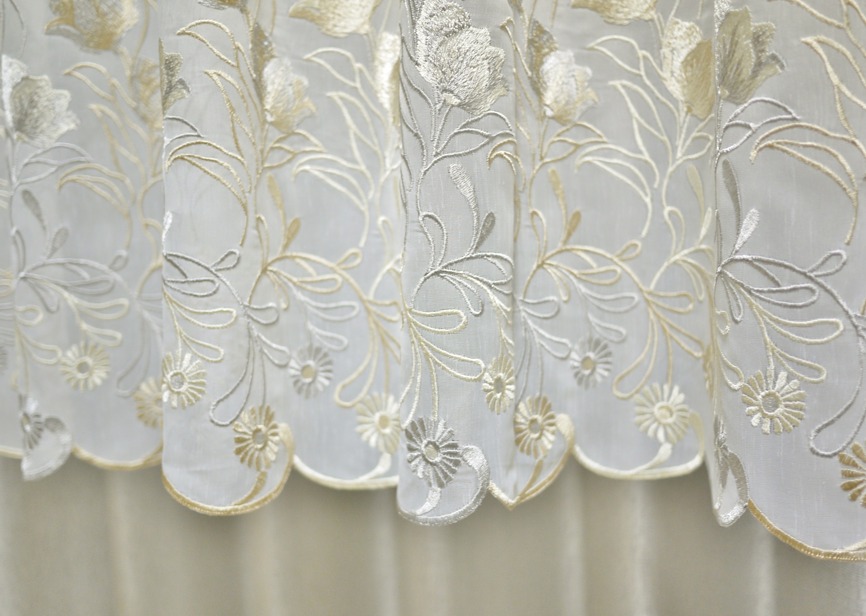カーテンのヒダ山/谷のウェーブを裾まで通し、生地の張りを抑え、裾が前後左右に広がらないようにするために、ファブリカではドレープ・レース共全品に形態安定加工を施しています(ポリエステル100%等の加工可能な生地のみ)。