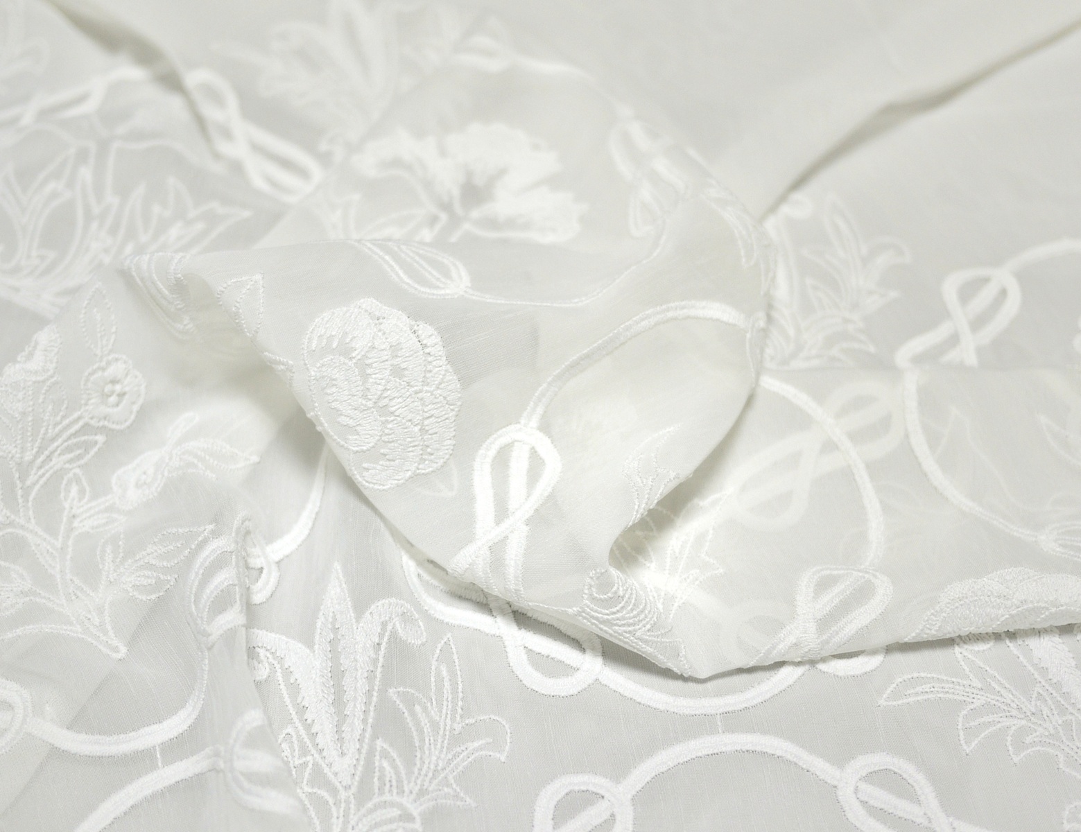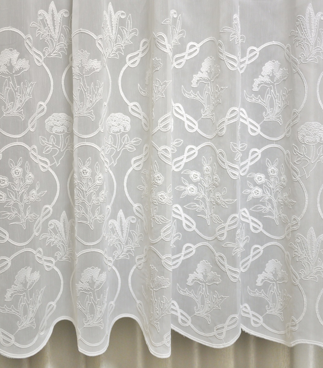 メイ・モリスがエメリー・ウォーカーの妻メアリーのために製作した、見事なクルーエル刺繍のベッドカバーがあります。そのデザインをもとに、薄手の刺繍生地として仕上げました。柄の表現には太い刺繍糸でボリューム感を持たせ、柄に沿った丁寧なステッチが施されています。
