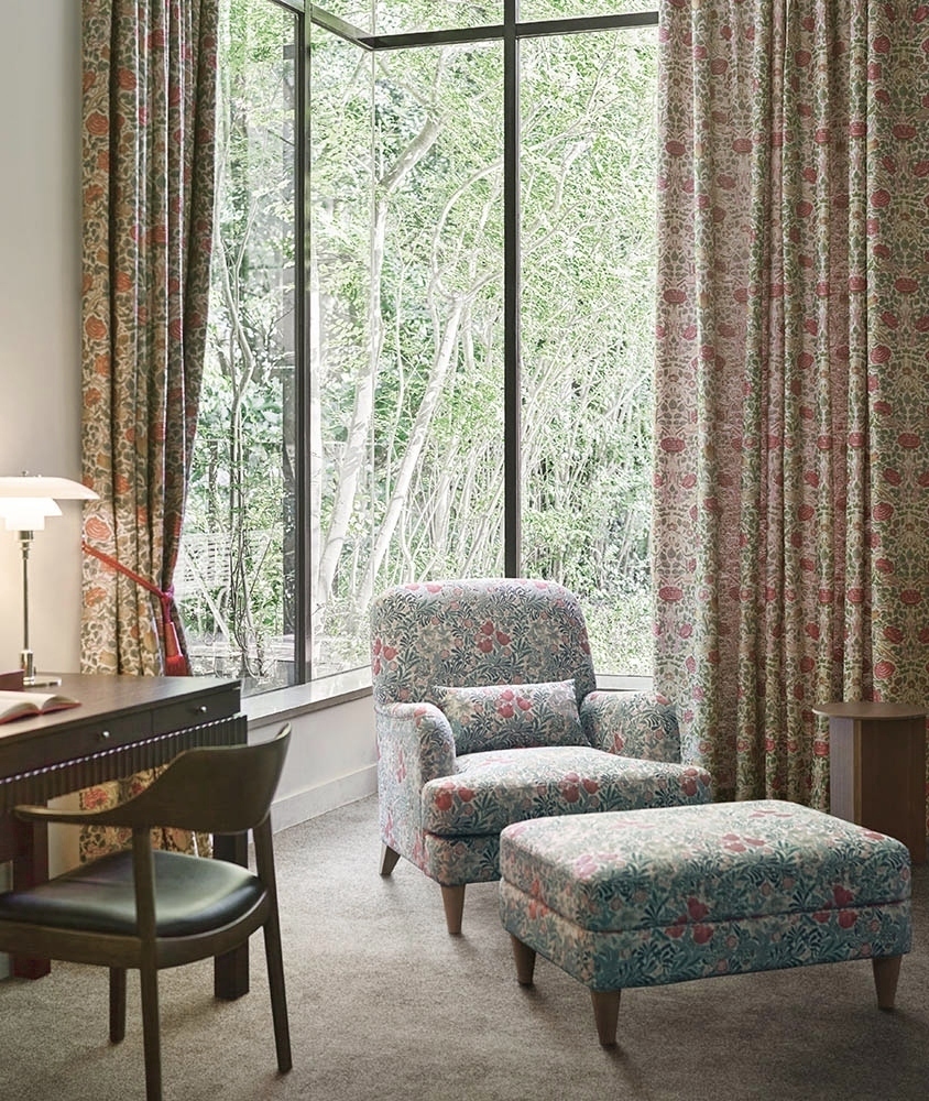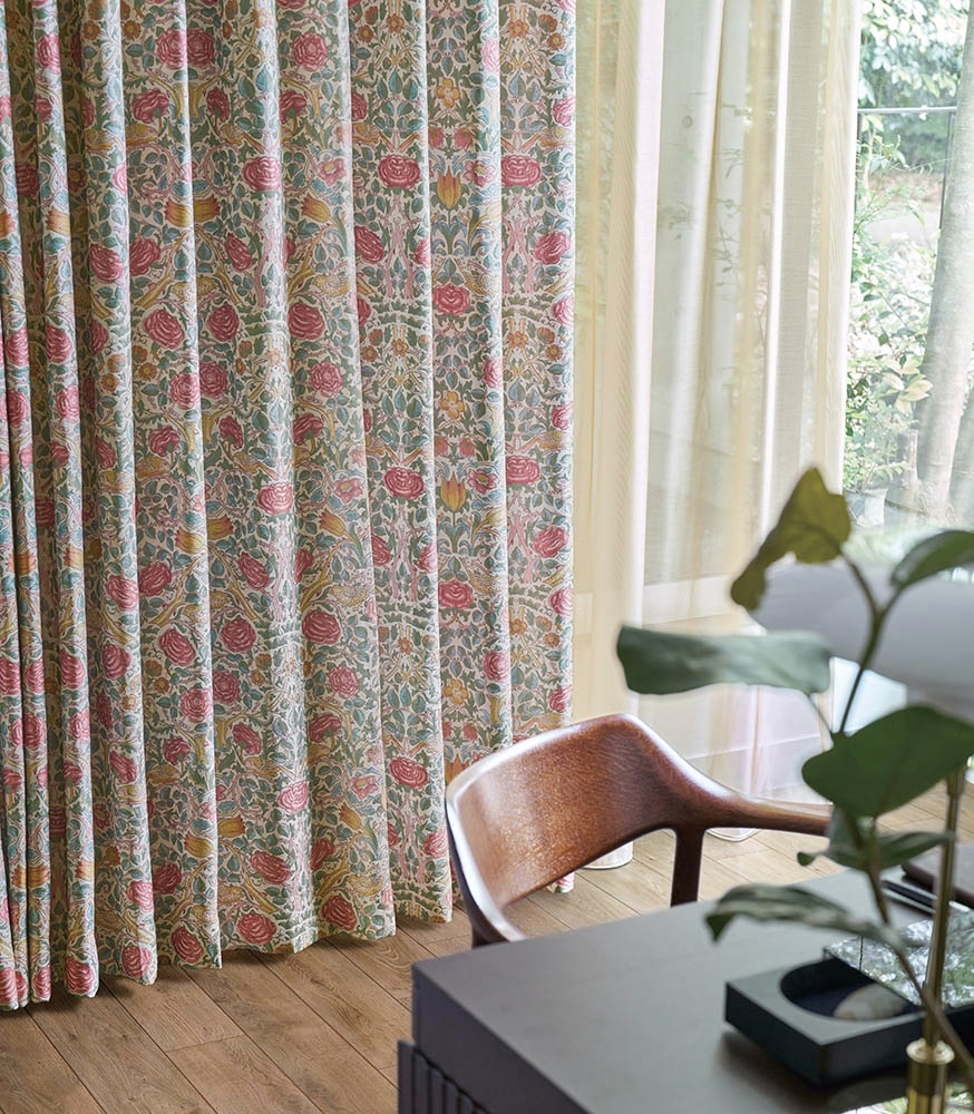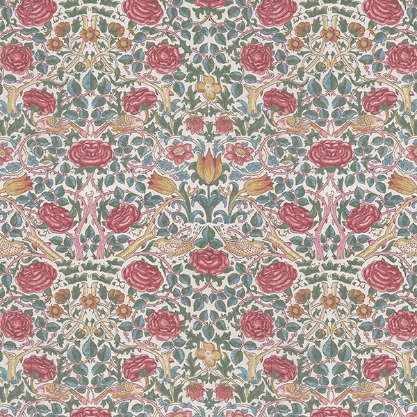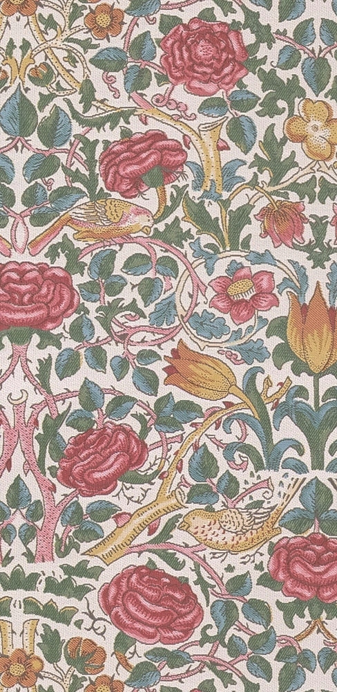 チューリップとバラが華やかに咲き誇り、茂みの中では陽気な二羽の鳥が戯れる、優雅で生き生きとしたデザインです。1883年、モリスによって家具用ファブリックとして製作され、親友であるエメリー・ウォーカー卿の居間にも用いられていました。