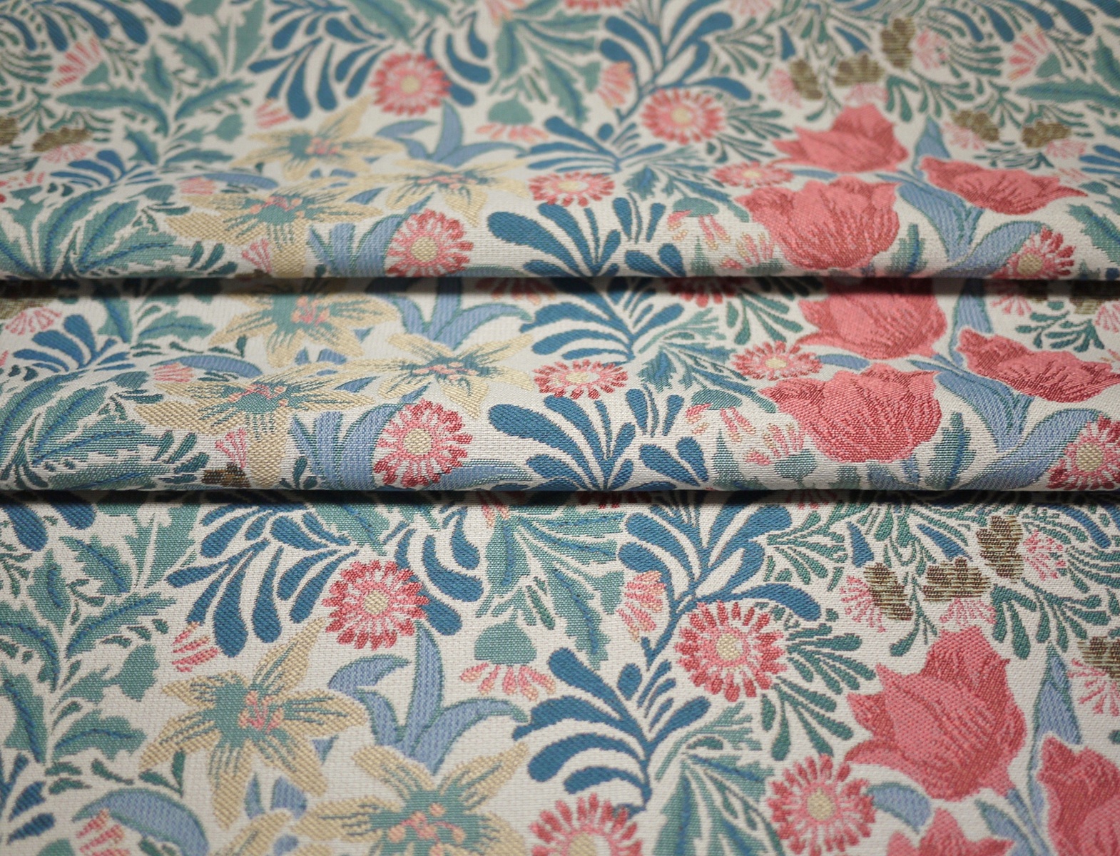 1877年にウィリアムモリスのデザインとして登録された柄で、咲き誇る花々と生命力に満ちた葉が織りなす、楽園の様な情景を描いています。重なり合う葉の表情には、織りの立体感と色彩の奥行きが巧みに表現され、空間に深味をもたらします。