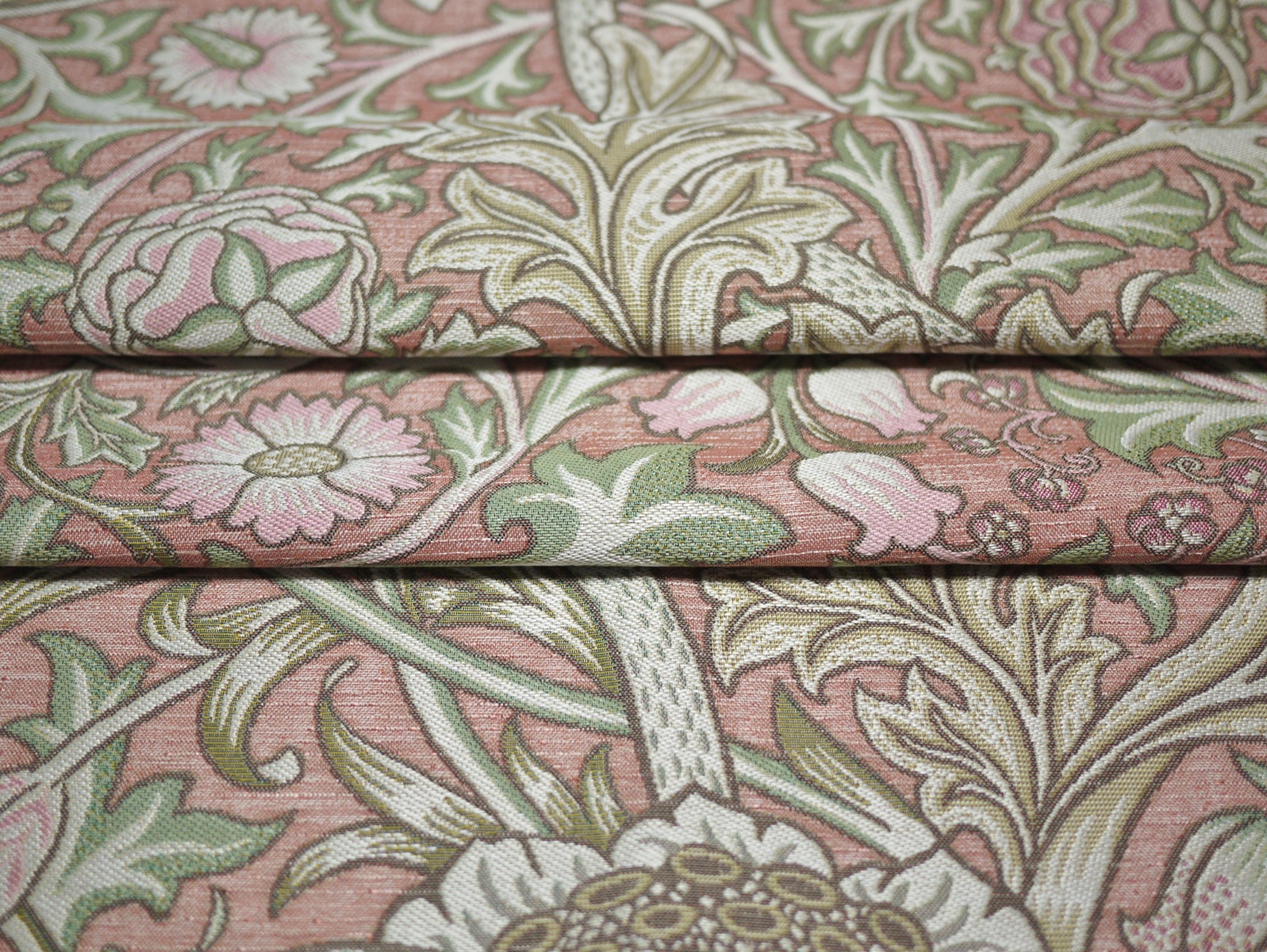 豊かで生命力あふれる花柄が印象的なデザインで、1888年にモリス商会によってプリントテキスタイルとして誕生しました。モリスらしい美意識が随所に感じられ、伸びやかなリピートと巧みに構成されたパターンが、空間に広がりをもたらします。